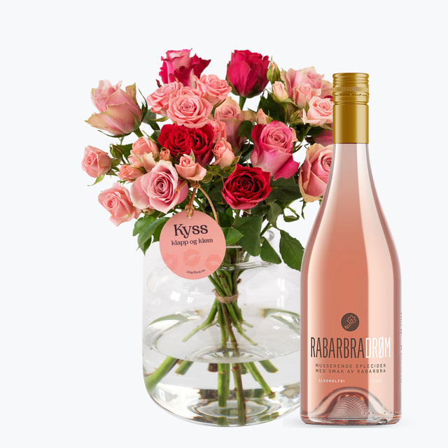 Rosebuketten spesielt designet for å si: Jeg er glad i deg! Overrask din utvalgte eller en du er glad i, og send Rosedrøm levert på døren. Buketten blir levert med en flaske sprudlende Cider med smak av rabarbra.